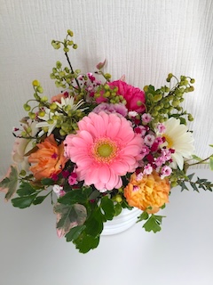 カーネーションやガーベラを中心に、春らしい雰囲気のアレンジメントです。